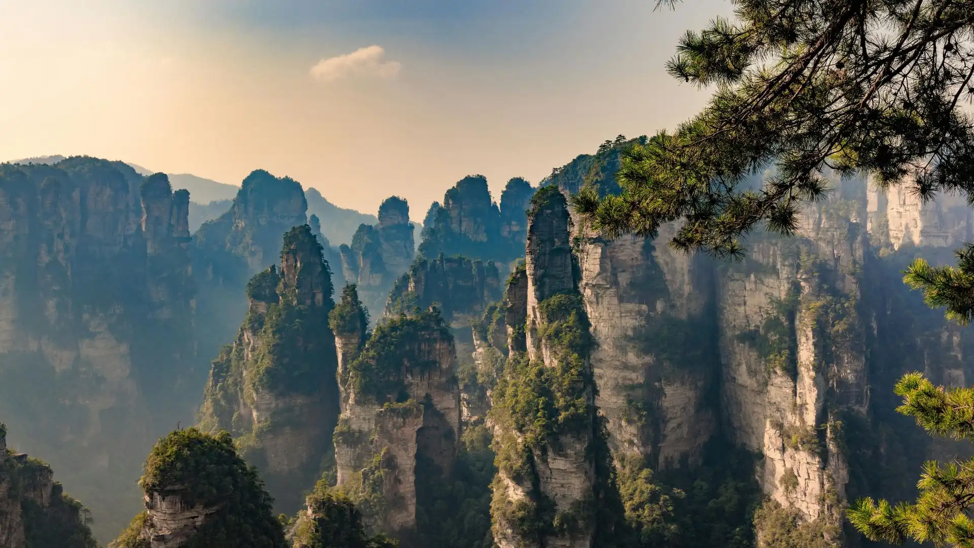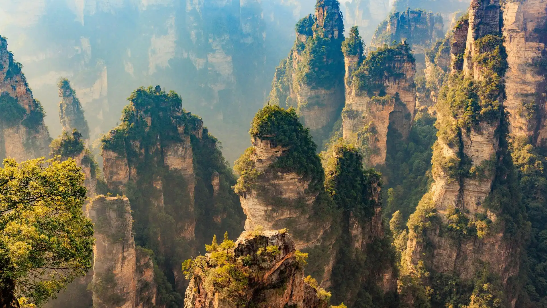 – Exploração do Parque Nacional de Zhangjiajie, famoso por suas colunas verticais de arenito que emergem da floresta como cenários irreais.